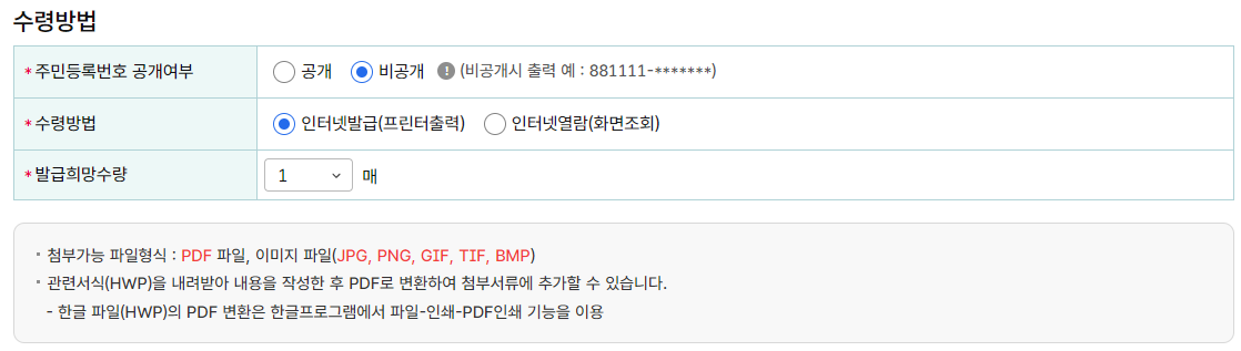 🔸 6단계 : 수령방법에서 주민등록번호는 비공개, 수령방법은 인터넷발급을 선택합니다.