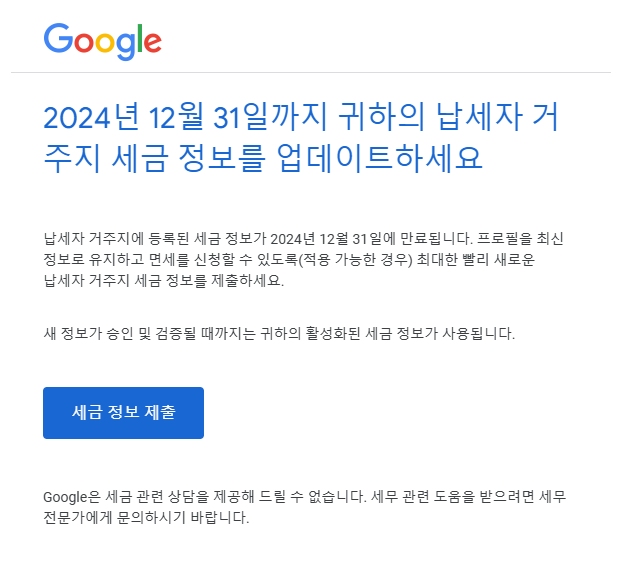 1. 12월에 구글에서 정보를 업데이트 하라는 메일을 받아도 메일 받은 당해 년도가 아닌 다음 년도에 업데이트를 실시해야 합니다. 예) 메일 받은 년도 2024년도 이면 2025년도에 실시