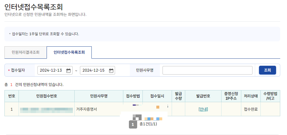 🔸 9단계 : 인터넷접수목록조회에서 '접수완료'되었음을 확인할 수 있습니다.
