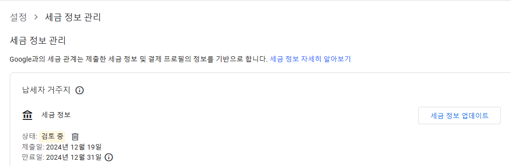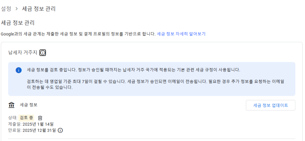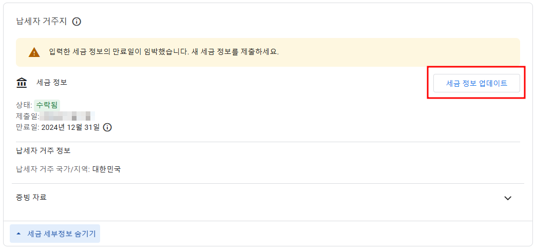 🔸 2단계 : 세금 정보 업데이트 클릭해 주세요.