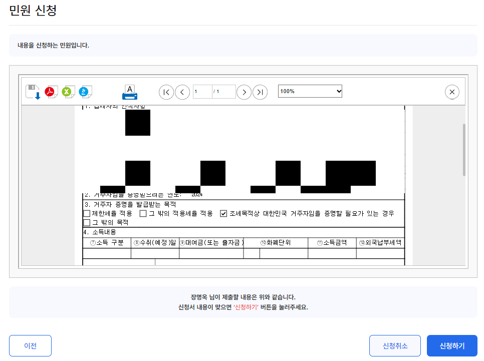 🔸 8단계 : 민원 신청 입력 내용 확인 후 '신청하기' 클릭합니다.