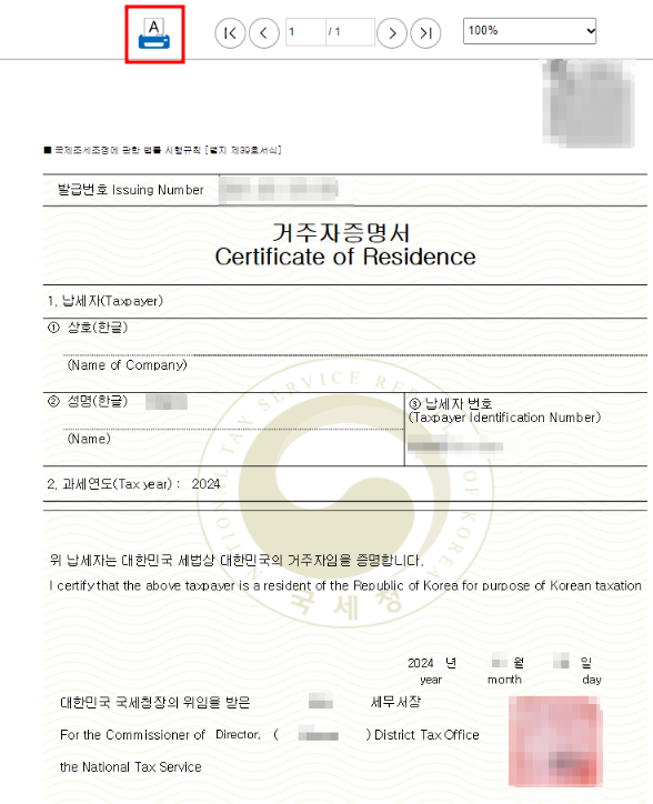 '거주자증명서'는 홈택스에서 발급할 수 있으며 보통 1~2일 정도 소요되므로 세금정보를 업데이트하기 전에 거주자증명서를 먼저 발급해 주세요.