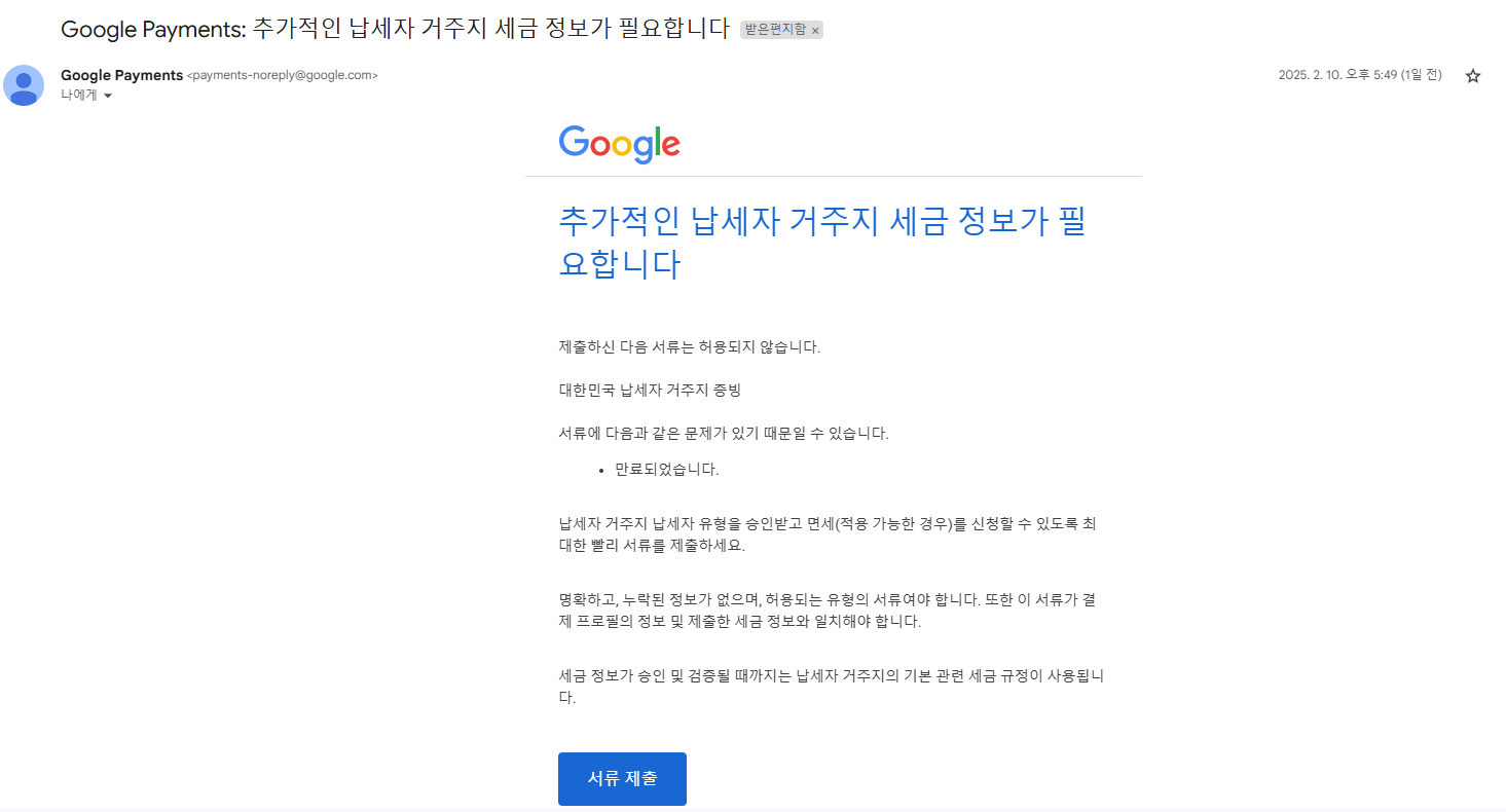 🚩 2025년 1월 14일 납세자 거주지 정보를 다시 제출하고 2월 10일 서류 추가제출 메일을 받았습니다. 사유는 '만료되었습니다. 과세연도를 2024년도로 제출해서 인하가여 메일하단의 파란색 '서류제출'을 클릭하여 2025년도 납세자 거주지 증명서를 재발급하여 다시 제출했습니다.