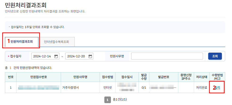 🔸 3단계 : 민원처리결과조회 → 출력 순으로 클릭해 주세요.