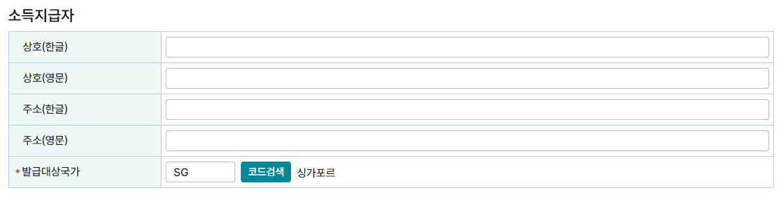 🔸 5단계 : 소득지급자에서 발급대상국가는 '코드검색'을 통해 싱가포르를 선택합니다.